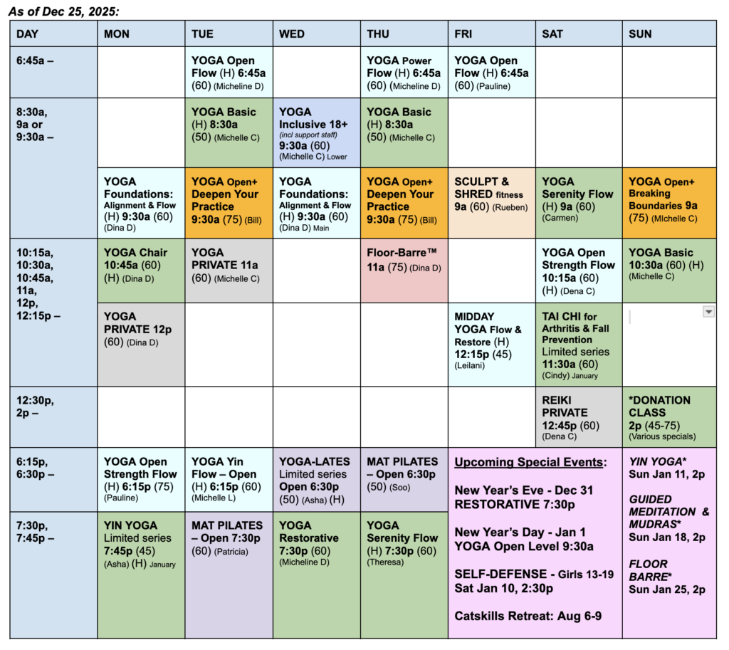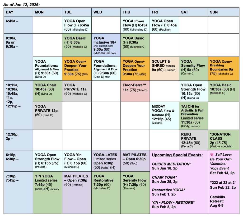 Scroll down to register. Schedule subject to change. Please sign up online at least one hour before class to confirm attendance numbers. (Text: (516) 880-3924 with any last minute changes.) Studio opens 10 minutes prior to class time. Thank you.
