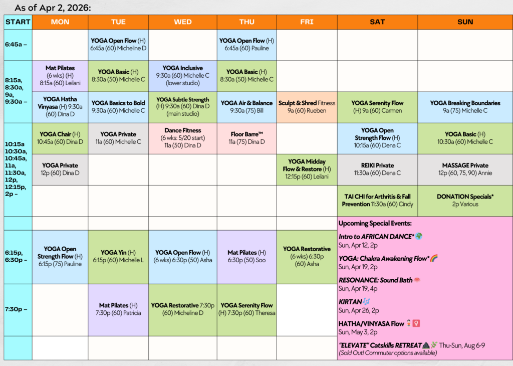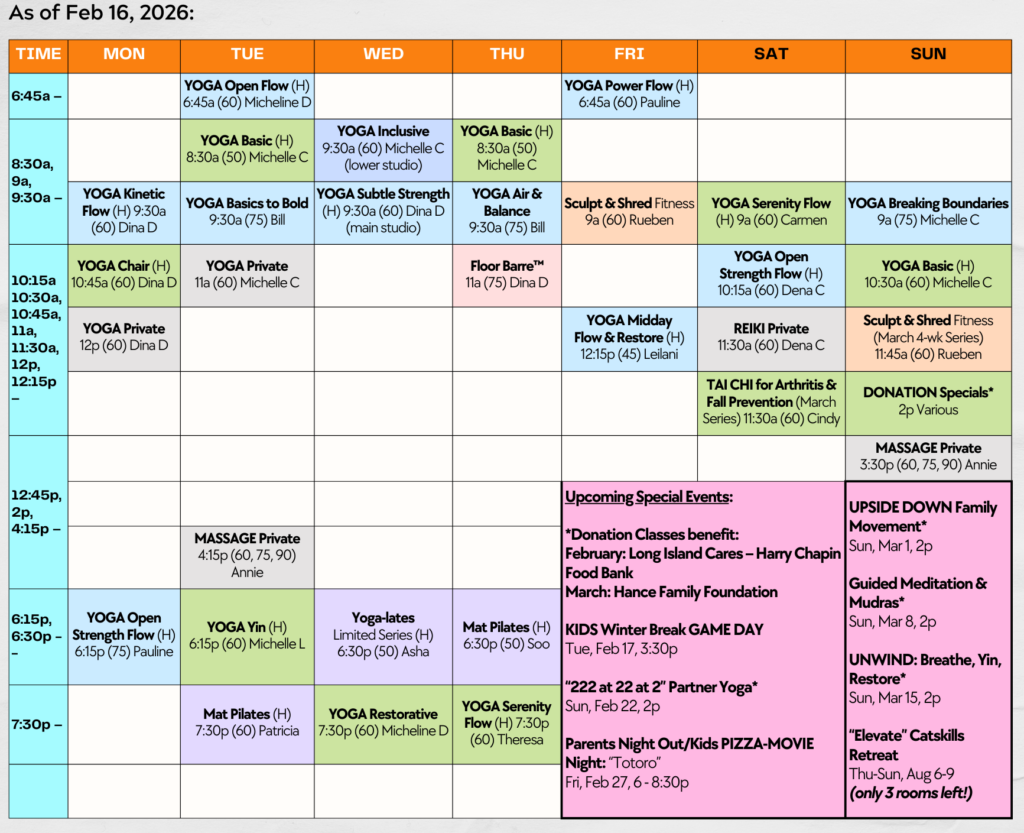 Scroll down to register. Subject to change. Please sign up online at least one hour prior. No-shows may be subject to cancellation fees. Studio opens 10 minutes prior. Emergencies: Text (516) 880-3924. Thank you.