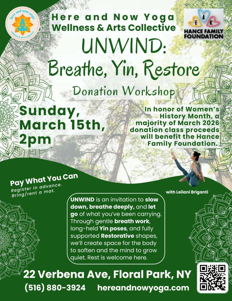 UNWIND: Breathe, Yin, Restore (Special Donation Class) with Leilani Briganti ~ Sunday, March 15, 2pm (60 min) A majority of proceeds donated to this class will benefit the Hance Family Foundation