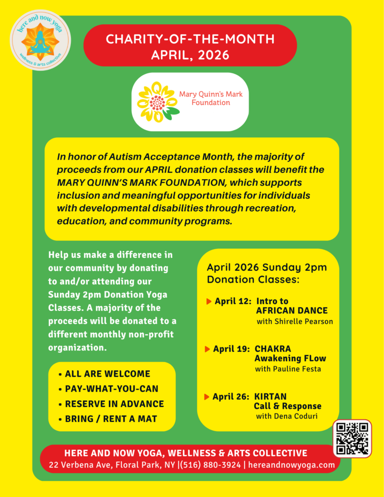 This class is part of our April community offerings in honor of Autism Acceptance Month, with donations supporting the Mary Quinn’s Mark Foundation, a Floral Park–based nonprofit dedicated to creating inclusive opportunities and support for individuals with disabilities.